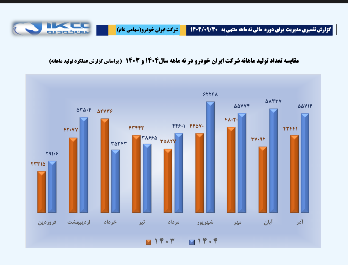به گزارش خط بازار؛ گروه ایران خودرو گزارش عملکرد ۹ ماهه ابتدای سال ۱۴۰۴ خود را در کدال منتشر کرد. براساس این گزارش تولید ایران خودرو نسبت به مدت مشابه سال گذشته ۱۷ درصد افزایش یافته و سهم کل تولید این شرکت به ۵۷ درصد رسیده است.