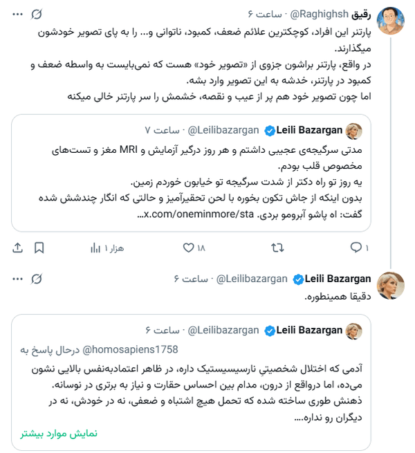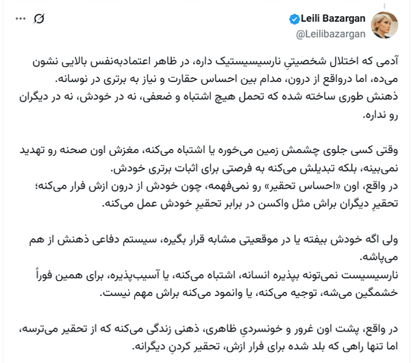 بازرگان درباره او عنوان میکند: «روابط، مخصوصاً وقتی با یه فرد با اختلال شخصیت نارسیسیست NPD درگیر باشی، خیلی پیچیدهتر از اونیه که از بیرون بهنظر میاد.اونجا منطق معمول کار نمیکنه؛ ذهنت، ادراکت، حتی خاطراتت دستکاری میشن. یهجور واقعیتِ موازی میسازی، و تا بیرون نیای، نمیفهمی چقدر از خودت دور شدی.»