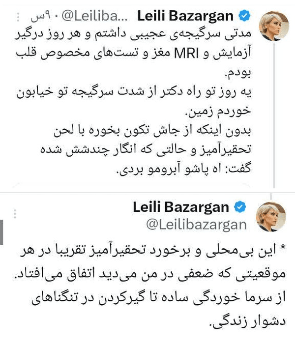 لیلی بازرگان درباره بدرفتاری این خواننده هتاک در زمانی که بیمار بوده است، مینویسد:«مدتی سرگیجهی عجیبی داشتم و هر روز درگیر آزمایش و MRI مغز و تستهای مخصوص قلب بودم. یه روز تو راه دکتر از شدت سرگیجه تو خیابون خوردم زمین.