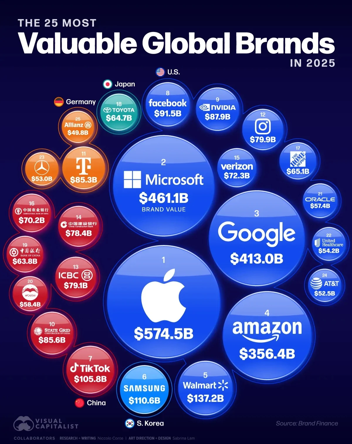 در مجموع، ارزش برند این چهار شرکت به حدود ۱.۸ تریلیون دلار میرسد که از مجموع ارزش ۲۰ برند بعدی در فهرست بیشتر است. دادههای این گزارش بر اساس تازهترین بهروزرسانی موسسه Brand Finance از فهرست ۵۰۰ برند ارزشمند جهان بهدست آمده است. این موسسه ارزش برند را بر پایه سه شاخص اصلی سرمایهگذاری بازاریابی، قدرت برند و عملکرد مالی میسنجد.