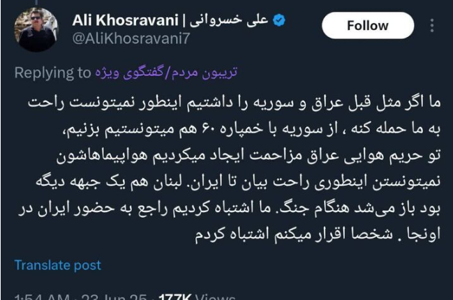 به گزارش خط بازار؛ علی خسروانی در پستی در ایکس نوشت: اقرار می‌کنم راجع به حضور ایران در سوریه و عراق اشتباه کردم.