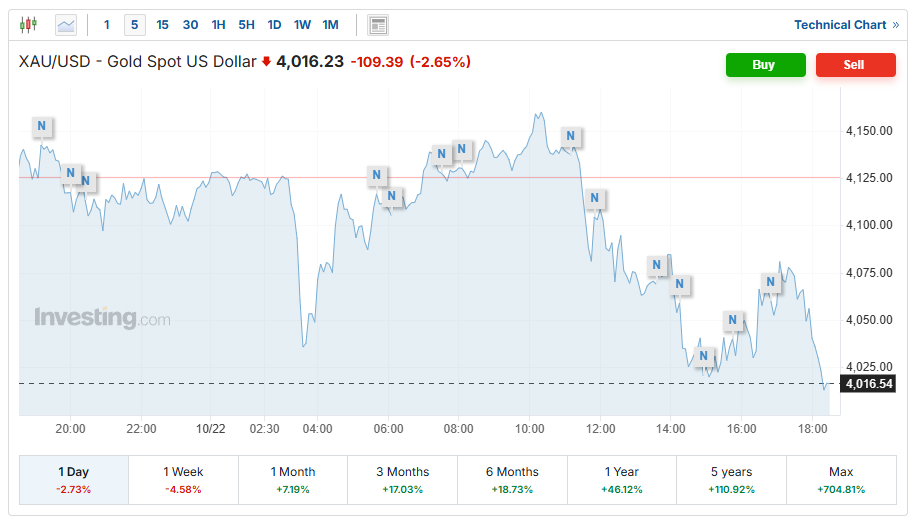 تحلیلگران معتقدند هم‌زمانی ریزش اونس جهانی و کاهش نرخ دلار، عامل اصلی افت قیمت‌ها در بازار طلا و سکه بوده است. در بازار جهانی، طلا پس از صعود تاریخی تا ۴٬۳۷۹ دلار در روز دوشنبه، وارد فاز اصلاحی سنگینی شد و طی دو روز تا محدوده ۴٬۰۰۴ دلار عقب‌نشست. این کاهش چشمگیر — که بزرگ‌ترین افت دو‌روزه طلا از سال ۲۰۲۰ تاکنون به‌شمار می‌آید — ناشی از شناسایی سود گسترده سرمایه‌گذاران، تقویت شاخص دلار آمریکا و آرام شدن تنش‌های تجاری میان واشنگتن و پکن بود.