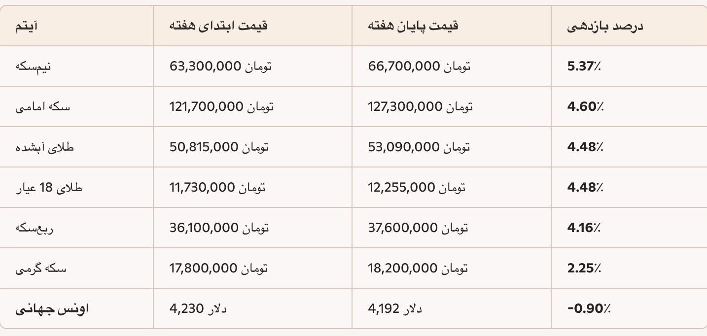 در انتها، سکه گرمی با ۲.۲۵٪ کمترین بازدهی را ثبت کرد، در حالی که اونس جهانی با افت ۰.۹٪ تنها آیتم منفی هفته بود. این رتبهبندی نشان میدهد فشار تقاضا بیشتر بر قطعات سنگینتر متمرکز بوده و دلار داخلی توانسته اثر افت اونس جهانی را جبران کند.
