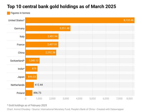 بانک ایتالیا اکنون پس از آمریکا و آلمان، سومین ذخیره طلای ملی بزرگ جهان را در اختیار دارد. ۲۴۵۲ تن طلای آن با قیمتهای فعلی تقریبا ۳۰۰ میلیارد دلار ارزش دارد که حدود ۱۳ درصد از تولید ناخالص داخلی ۲۰۲۴ این کشور را تشکیل میدهد.