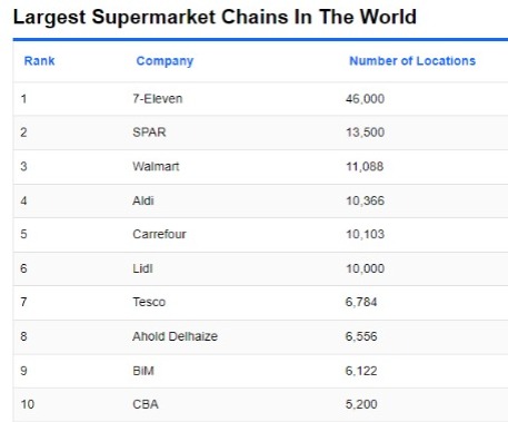 سوپرمارکت های زنجیره ای تسکو ۶۷۸۴ شعبه در سراسر جهان دارد. این زنجیره با دفتر مرکزی در انگلستان، در ۱۲ کشور شعبه دارد. Ahold Delhaize که دفتر مرکزی آن در هلند است، دارای ۶۵۵۶ شعبه در اروپا و ایالات متحده است. BiM یک سوپرمارکت مستقر در ترکیه است. مراکز فروش آن به مراکش و مصر گسترش یافت. BiM در مجموع ۶۱۲۲ پریز دارد. جایگاه دهم سوپرمارکت CBA با شعبه هایی در ۱۱ کشور در قاره اروپا است. این شرکت که در سال ۱۹۹۲ تاسیس شد، بیش از ۳۰۰۰۰ کارمند دارد. دفتر مرکزی در مجارستان است. مراکز فروش در اسلواکی، لیتوانی، کرواسی، صربستان، بلغارستان، مالت، یونان، مونته نگرو، ایتالیا، رومانی و لهستان هستند.