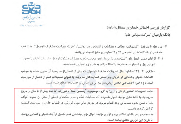این یعنی بانک پارسیان تسهیلاتی که مشکوک الوصول بوده و به بانک بازنگشته را در ردیف تسهیلاتی که در حال پرداخت اقساط هستند یا تسهیلاتی که بین ۲ تا ۶ ماه از سررسید آن‌ها گذشته طبقه‌بندی کرده است.