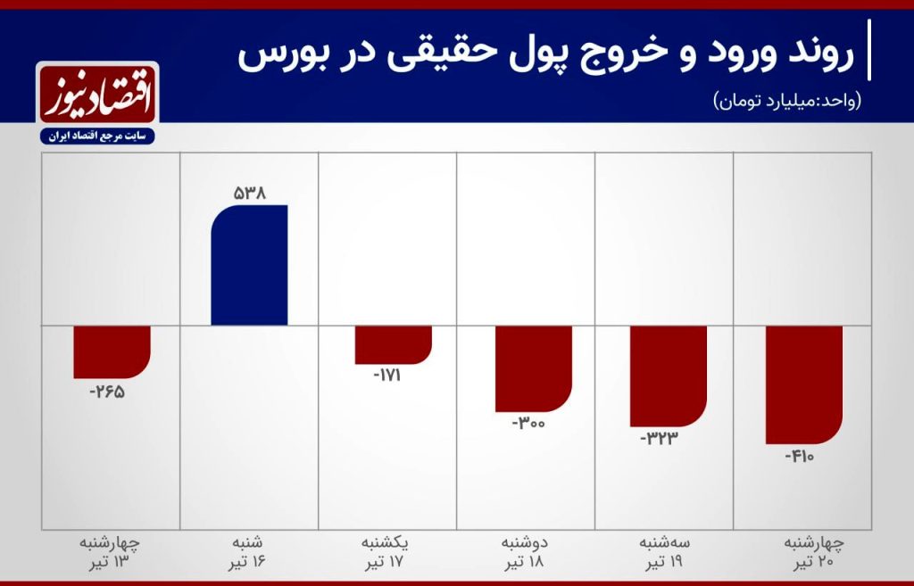 روز سهشنبه نیز ۳۲۳ میلیارد تومان پول حقیقی خارج شد. در آخرین روز معاملاتی هفته برای چهارمین روز متوالی پول حقیقی خارج شد و ارزش تغییر مالکیت حقیقی به حقوقی بازار ۴۱۰ میلیارد تومان بود.
