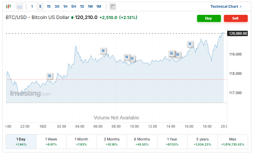 بیتکوین روز خود را در نرخ ۱۱۸,۶۵۰ دلار آغاز کرد و در ادامه تا ظهر در میانه کانال ۱۱۸ هزار دلاری نوسان داشت. این نوسان بیشتر در محدودهای ۳۰۰ دلاری به سمت بالا رخ داد که نشانهای از تقویت تقاضا پس از دورهای از رکود نسبی بود. در نیمه دوم روز، بیتکوین با مسیر صعودی ابتدا وارد کانال ۱۱۹ هزار دلاری شد و سپس موفق شد مقاومت روانی ۱۲۰ هزار دلار را فتح کند. این ارز دیجیتال پیشرو حتی تا ۱۲۰,۲۰۰ دلار بالا رفت و در لحظه نگارش این گزارش در نرخ ۱۲۰,۰۸۰ دلار معامله میشود؛ سطحی که از نگاه تحلیلگران نقطه عطفی برای حرکتهای بعدی محسوب میشود.