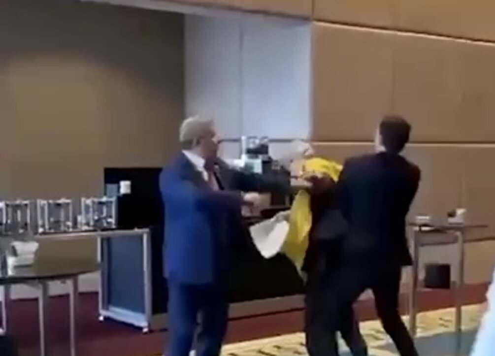 به گزارش خط بازار؛ اعضای هیئتهای روسی و اوکراینی شرکت کننده در نشستی اقتصادی در ترکیه به دنبال به اهتزاز درآوردن پرچم اوکراین در این نشست و اقدام عضو هیئت روسی به کشیدن آن از دست همتای اوکراینی با یکدیگر درگیر شدند.