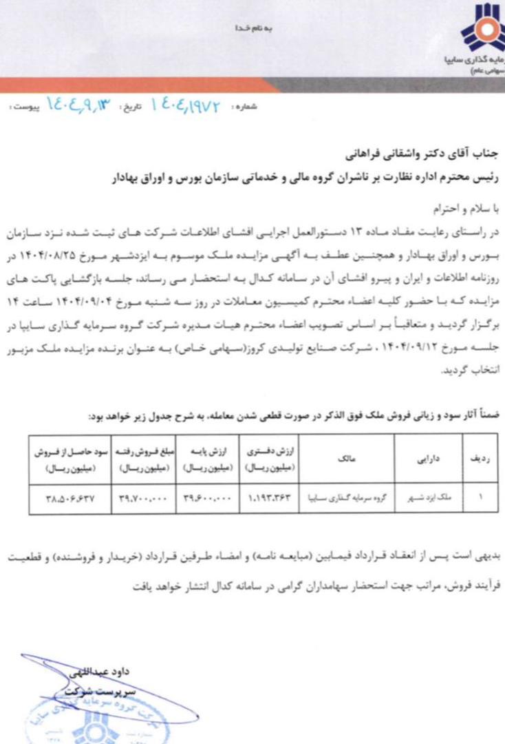 شرکت کروز برنده مزایده ملک ایزدشهر وساپا شد. شرکت گروه سرمایهگذاری سایپا اعلام کرد که مزایده مربوط به ملک موسوم به ایزدشهر به نتیجه رسیده و شرکت صنایع تولیدی کروز بهعنوان برنده این مزایده انتخاب شده است.