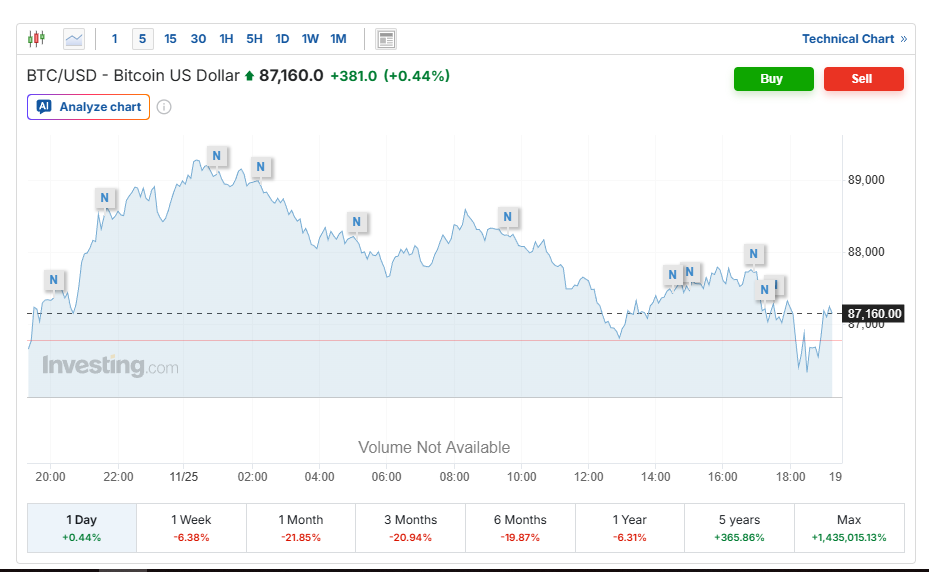 در ادامه روز، تلاش محدود خریداران باعث بازگشت نرخ تا سطح ۸۷ هزار و ۸۰۰ دلار شد، اما فشار فروش مجدد موجب شد بیتکوین تا ۸۶ هزار و ۳۱۵ دلار کاهش یابد. در زمان نگارش این گزارش، بیتکوین در محدوده ۸۷ هزار و ۱۶۰ دلار معامله میشود.
