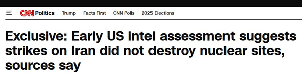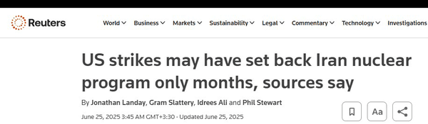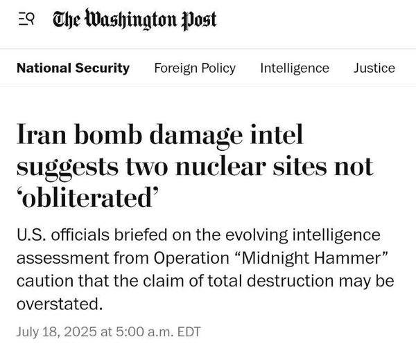 واشنگتنپست نیز در این زمینه گزارش داد: «اطلاعات مربوط به خسارات ایران نشان میدهد که دو سایت هستهای نابود نشدهاند. مقامات آمریکایی که در جریان ارزیابی اطلاعاتی از عملیات چکش نیمهشب قرار گرفتهاند، هشدار میدهند که ادعای تخریب کامل، ممکن است اغراقآمیز باشد.»