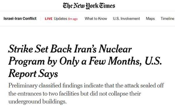 نشریه آمریکایی نیویورکتایمز در گزارشی تاکید کرد: «یافتههای طبقهبندیشده نشان میدهد که حمله آمریکا، ورودیهای تأسیسات را مسدود کرده؛ اما ساختمانهای زیرزمینی آنها را فرونریخته است.»