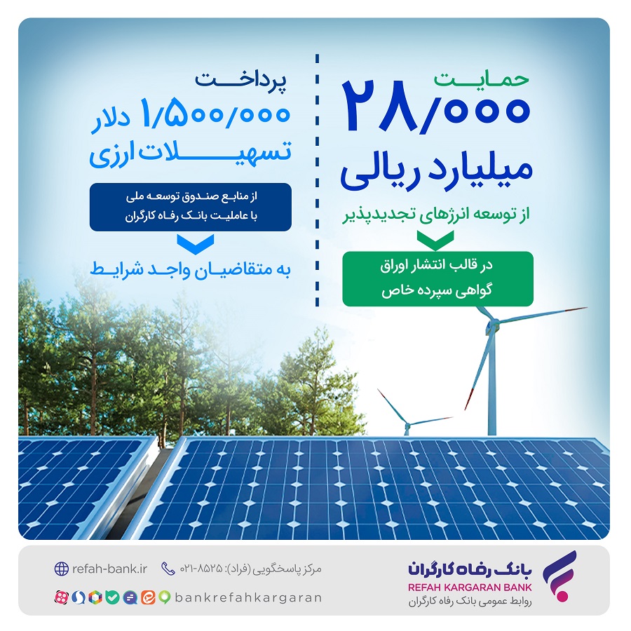 حمایت 28.000 میلیارد ریالی بانک رفاه کارگران از توسعه انرژی‌‌های تجدیدپذیر در سال جاری