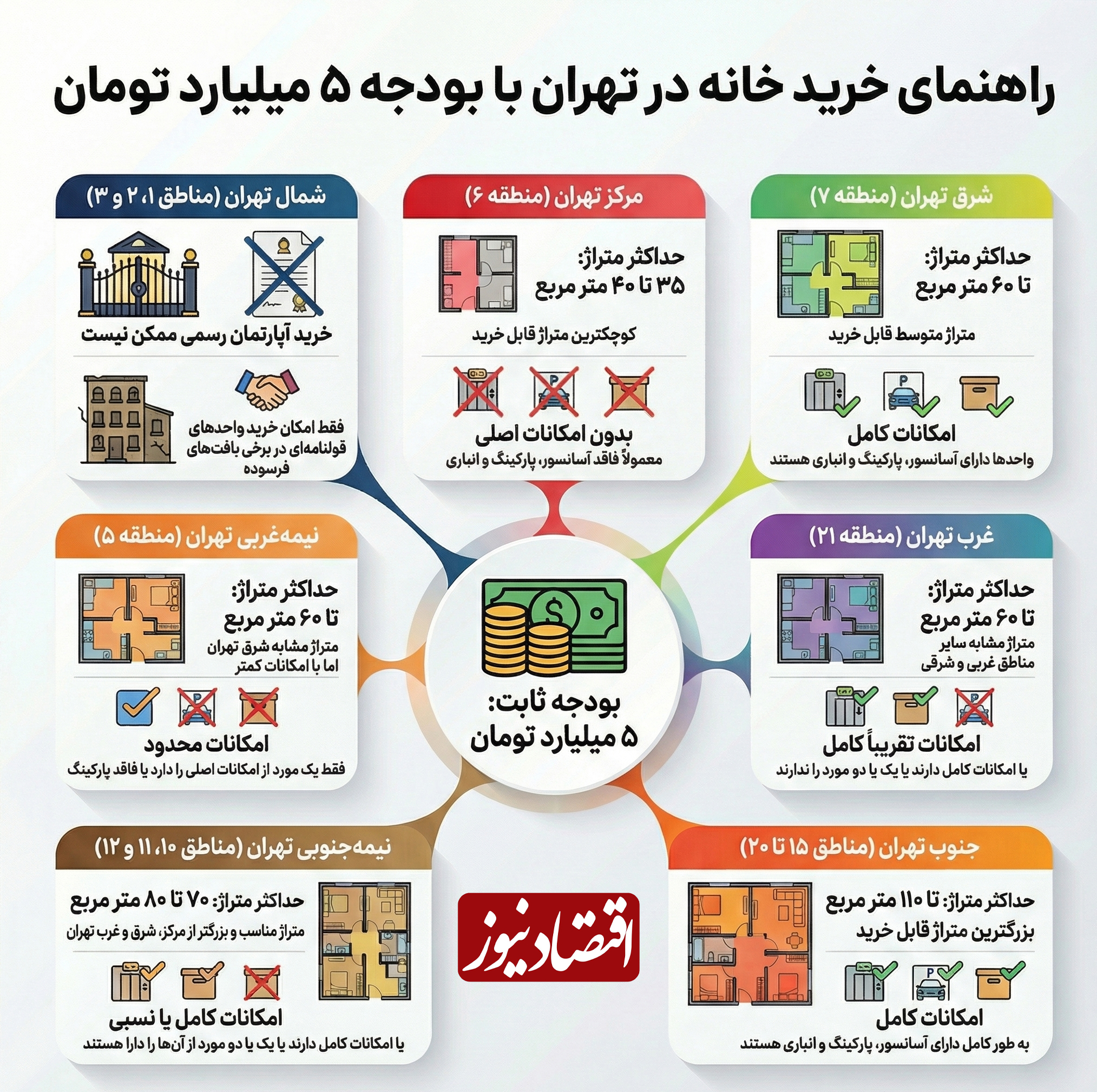 به گزارش خط بازار؛ با بودجهای معادل ۵ میلیارد تومان در نقاط مختلف تهران چه آپارتمانی و با چه امکاناتی میتوان خرید؟