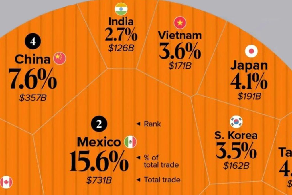طبق آمار منتشر شده در وبسایت ویژوال کاپیتالیست، مکزیک با سهم ۱۵.۶ درصدی، بزرگترین شریک تجاری آمریکا در سال ۲۰۲۵ است؛ کشوری که در سالهای گذشته نهتنها تنشهای سیاسی شدیدی و دامنهداری با آمریکا داشته، بلکه در موضوع تعرفههای تجاری، امنیت مرزی، مهاجران غیرقانونی و مواد مخدر نیز درگیری زیادی با این کشور داشته و به ویژه در دوران ترامپ مورد هجمه شدید او قرار گرفته است. اما با تمام این احوال، مکزیک توانسته به بزرگترین شریک تجاری آمریکا شود و حجم تجارت خود را با این کشور به عدد ۷۳۱.۲ میلیارد دلار برساند.