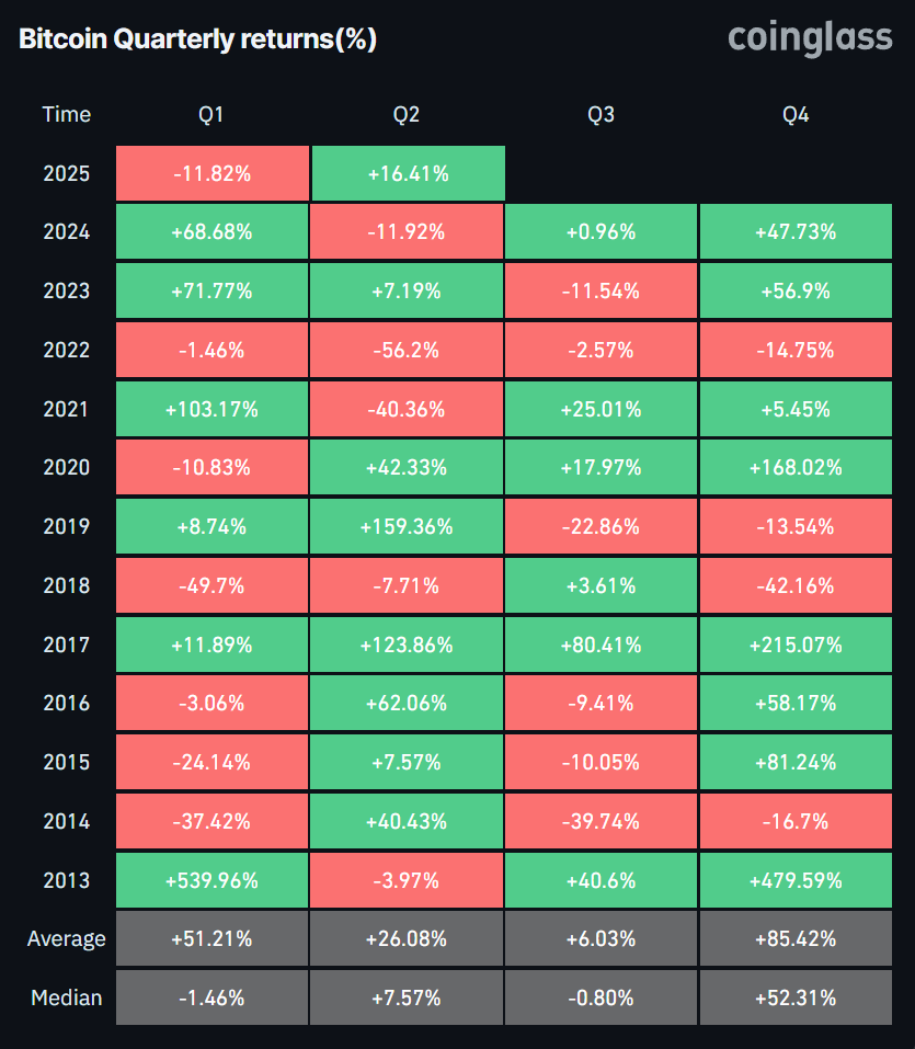 عوامل فصلی معمولاً باعث کاهش شور و اشتیاق تابستانه میشوند. به طور تاریخی، بیت کوین در سهماهه دوم به طور متوسط ۲۶ درصد افزایش یافته است، اما میانگین آن از سال ۲۰۱۳ تنها ۷.۶ درصد بوده است. افتهای شدید، مانند کاهش ۵۶.۲ درصدی در سهماهه دوم ۲۰۲۲، نیز رخ داده است. سهماهه سوم معمولاً ضعیفتر است و میانگین بازدهی آن ۶ درصد و میانگین منفی جزئی است. با نزدیک شدن به ماه مه، بسیاری منتظر اثر «فروش در ماه مه» هستند که در سهام مشاهده میشود، جایی که S&P 500 از سال ۱۹۵۰ تنها ۱.۸ درصد از ماه مه تا اکتبر بازدهی داشته است.