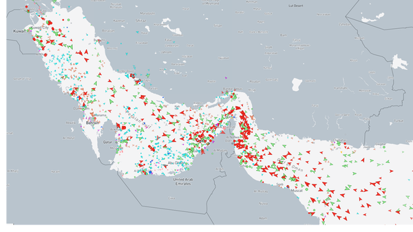 نقاط قرمز رنگ نشان دهنده نفتکشهای متوقف شده در مختصات پیش از ورود به تتنگه هرمز