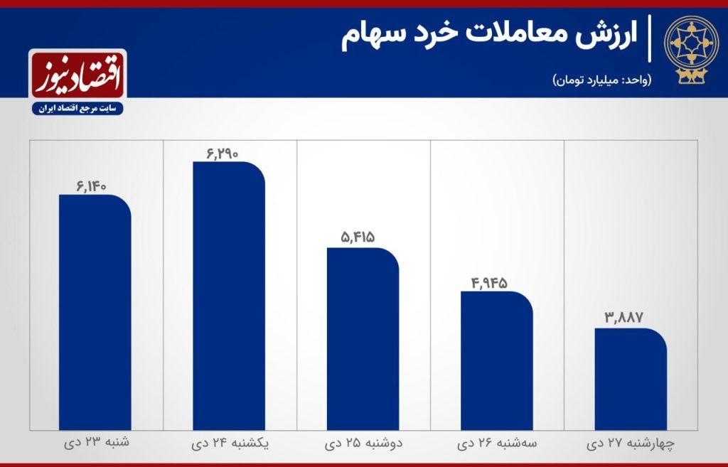 روز دوشنبه نیز ارزش معاملات خرد به ۵ هزار و ۴۱۵ میلیارد تومان رسید. ارزش معاملات در روز سه‌شنبه به ۴ هزار و ۹۴۵ میلیارد تومان کاهش یافت.