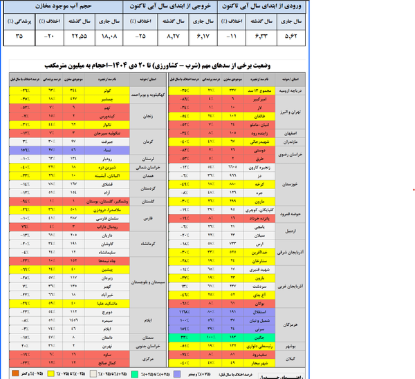 میزان ورودی آب به مخازن سدهای کشور در سال آبی جاری که از مهرماه شروع شده، تاکنون به ۵.۶۲ میلیارد متر مکعب رسیده که نسبت به رقم مشابه سال قبل از ۱۱ درصد کاهش یافته است.میزان خروجی آب از سدهای کشور در سال آبی جاری، به ۶.۱۷ میلیارد متر مکعب رسید که نسبت به رقم مشابه سال قبل ۲۵ درصد کاهش دارد، لذا لازم است در مصرف آب صرفه جویی شود تا کمبود مخازن جبران شود.