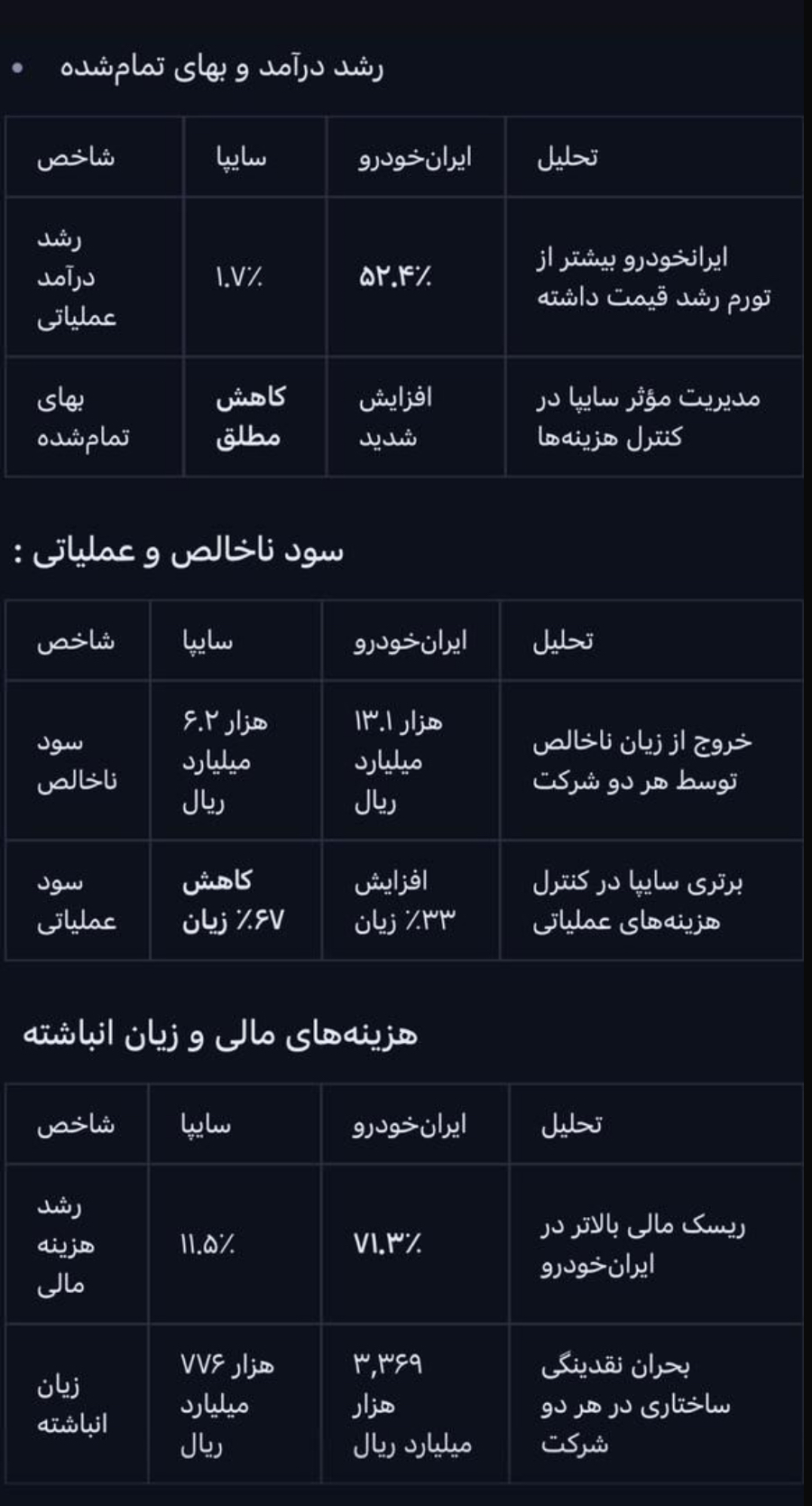 ای کاش اونیکه نوشته یک ذره سواد مالی داشت مگه میشه ۴۰ درصد تولید کم بشه از اون طرف ایران خودرو ۱۰ درصد بیشتر تولید کنه بعد بیایی از سایپا دفاع کنی برادر سایپا افزایش قیمت سازنده ها رو نداده هزینه ها حدودا ۴۰ درصد افزایش داشته تولید ۴۰ درصد کاهش داشته بعد زیان کمتر شده پول نداره حقوق بده بزار حسابرسی شده بیاد اونوقت اظهار نظر کن بررررررراااااااادر
