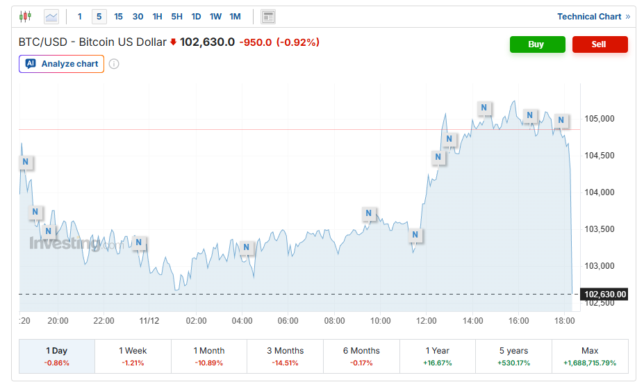 قیمت بیتکوین که در ابتدای روز با نرخ ۱۰۶ هزار و ۱۶۰ دلار آغاز شد، پس از صعود اولیه تا محدوده ۱۰۵ هزار و ۲۶۰ دلار، در ادامه مسیر نزولی گرفت و در لحظه نگارش این گزارش روی سطح ۱۰۲ هزار و ۶۳۰ دلار قرار دارد.