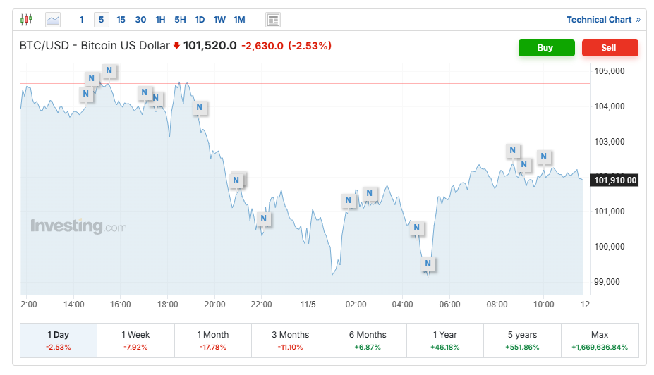 سقوط بیتکوین به زیر۱۰۰٬۰۰۰ دلار