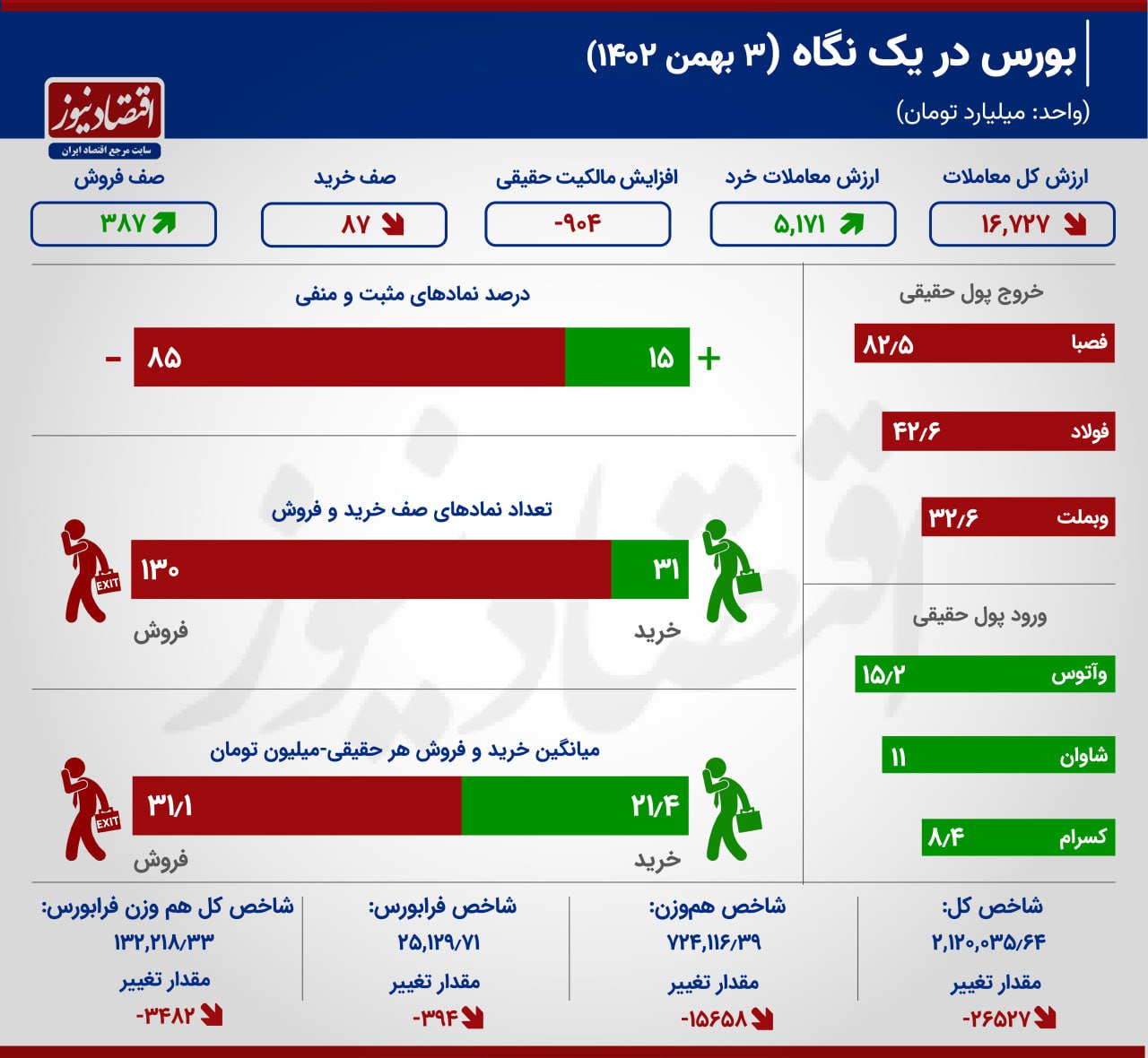 در معاملات سهشنبه، ۳۱ نماد صف خرید داشتند و ۱۳۰ نماد با صف فروش مواجه بودند. مجموع ارزش صفهای خرید با افت ۶ درصدی نسبت به روز کاری قبل به ۸۷ میلیارد تومان کاهش یافت و مجموع ارزش صفهای فروش نیز با افزایش ۸۰ درصدی به ۳۸۷ میلیارد تومان رسید.