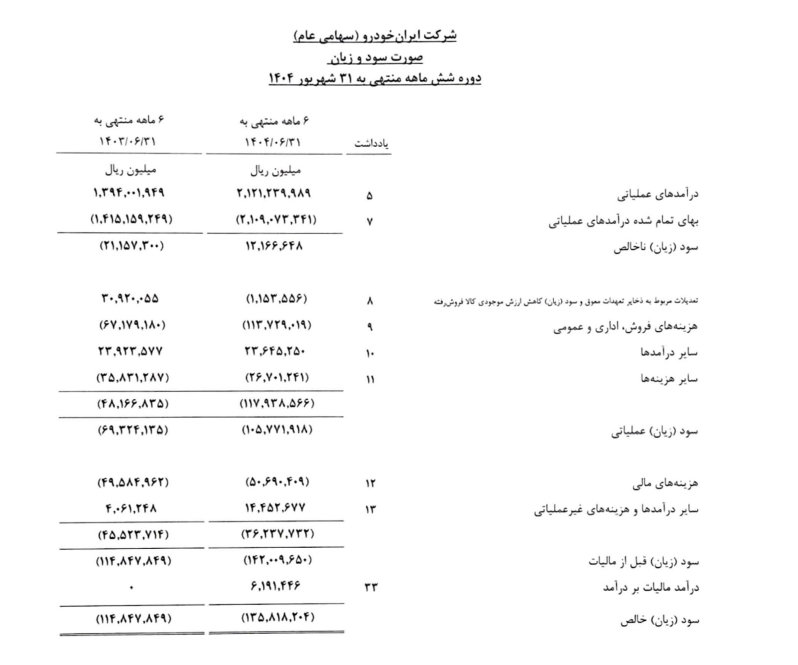 از طرف دیگر زیان عملیاتی در نیمه اول سال ۱۴۰۴ نسبت به مدت مشابه سال قبل ۵۲ درصد افزایش داشته و در این بازه زمانی ۲ همت زیان خالص نسبت به مدت مشابه سال قبل به ایران خودرو اضافه شده است.