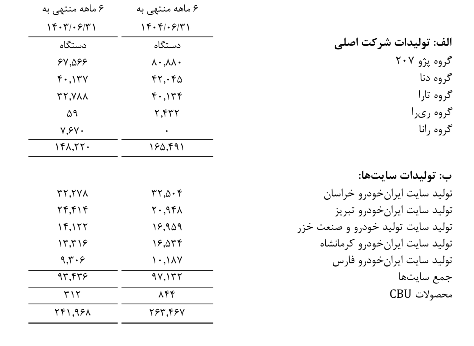 طبق این آمار، تولید گروه پژو ۲۰۷، تارا و ری را افزایش قابل ملاحظه ای داشته است. در بین سایت های تولیدی نیز فقط ایران خودرو تبریز عملکرد ضعیفی داشته است. با کاهش حدود ۳ هزار و ۴۰۰ دستگاه در شش ماه اول ۱۴۰۴ نسبت به مدت مشابه سال قبل.
