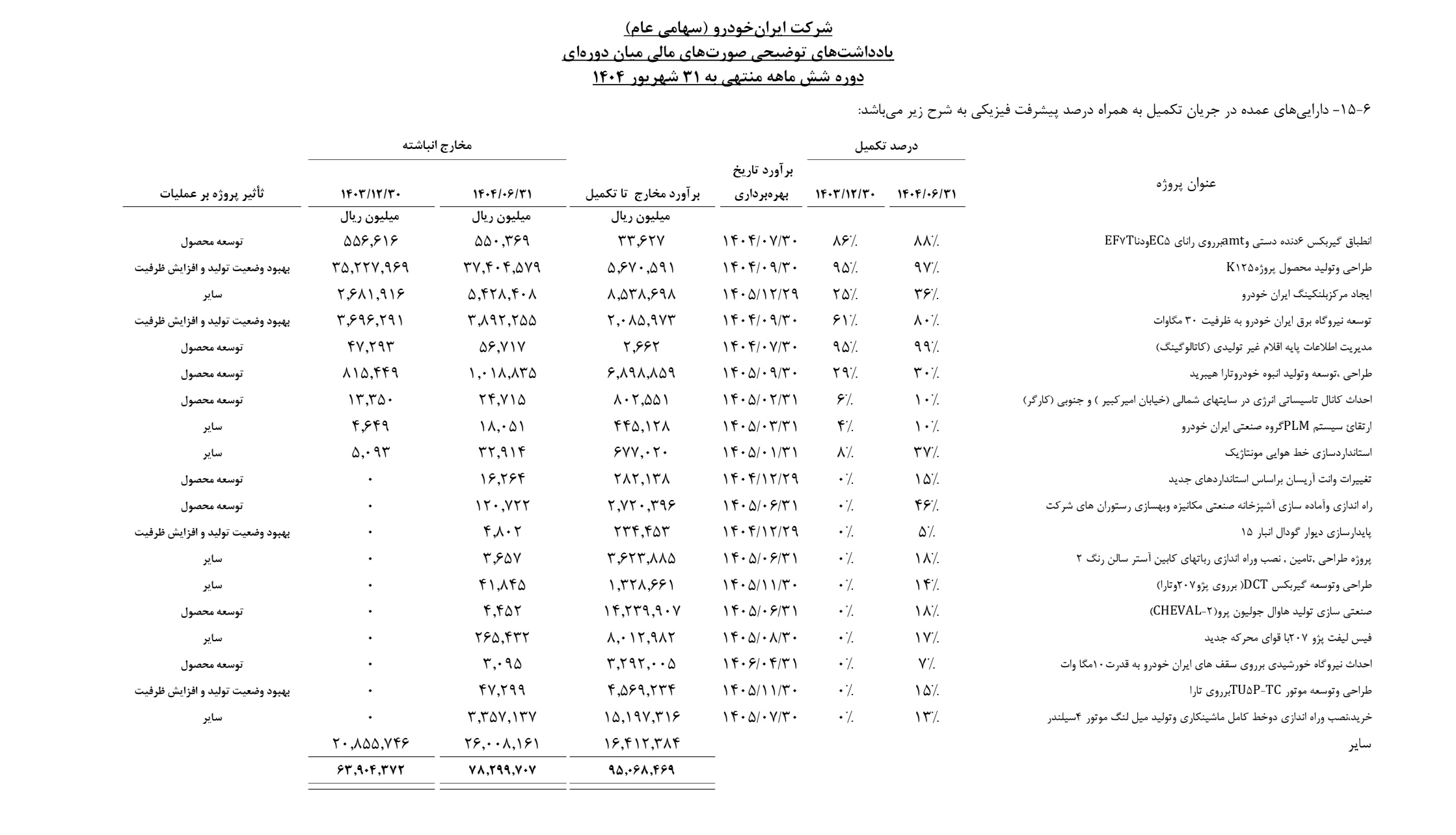 غالب پروژه های سال ۱۴۰۳ در سال ۱۴۰۴ پیشرفت فیزیکی کمی داشتند به طوری که برخی از آنان ۱ درصد پیشرفت داشتند. این در حالی است که ۱۰ پروژه جدید در سال جدید آغاز شده که می توان به «راه اندازی آشپزخانه صنعتی و بهینه سازی رستوران های شرکت»، «طراحی و توسعه گیربکس DCT» و «صنعتی سازی تولید هاوال جولیون» اشاره کرد.