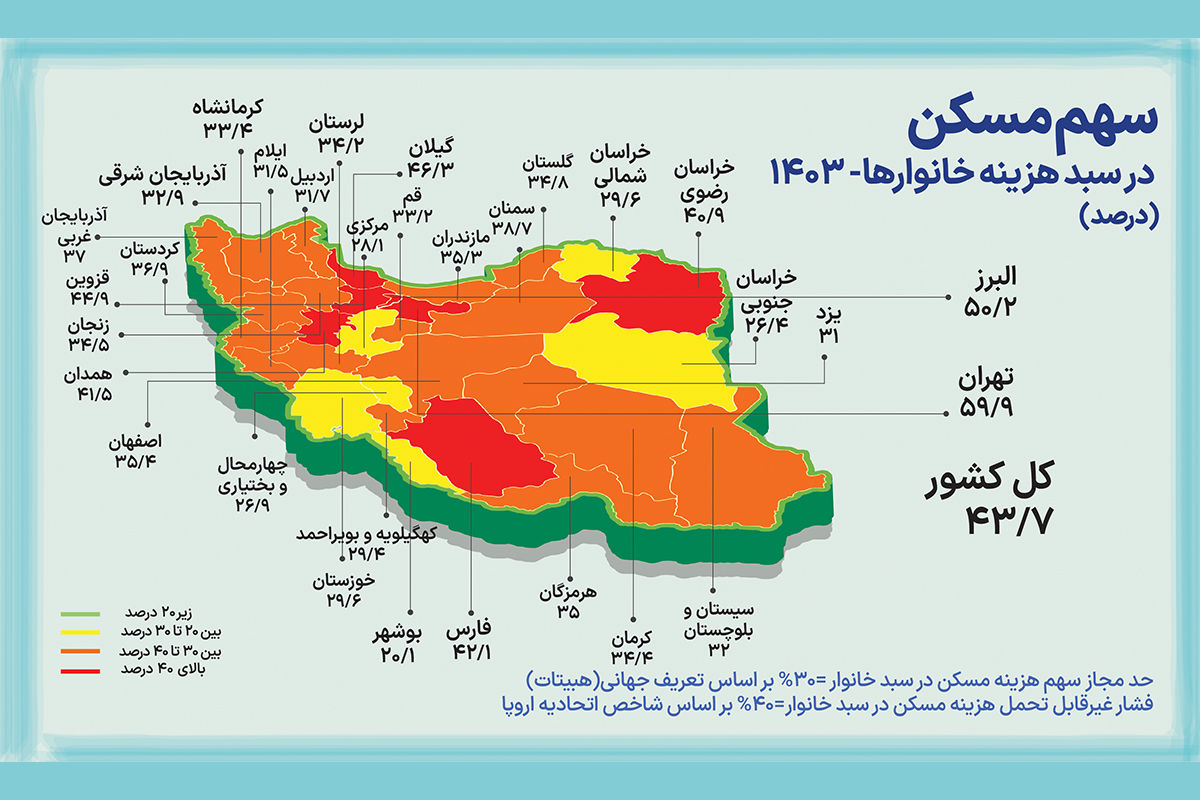 سهم هزینه مسکن در سبد هزینه‌های ماهانه خانوارهای شهری ایران باز هم جهش کرد و به ۴۳.۷ درصد رسید؛ طبق تعریف اتحادیه اروپا وقتی «فاکتور اجاره‌خانه» بیش‌از ۴۰ درصد کل مخارج یک خانوار را می‌بلعد «مستاجرها تحت فشار غیرقابل تحمل اقتصادی» قرار دارند و نیازمند «سیاست‌های حمایتی مرتبط با مسکن‌اجاره‌ای» در کوتاه‌ترین زمان هستند، نه ابتدا «مسکن‌ملکی».