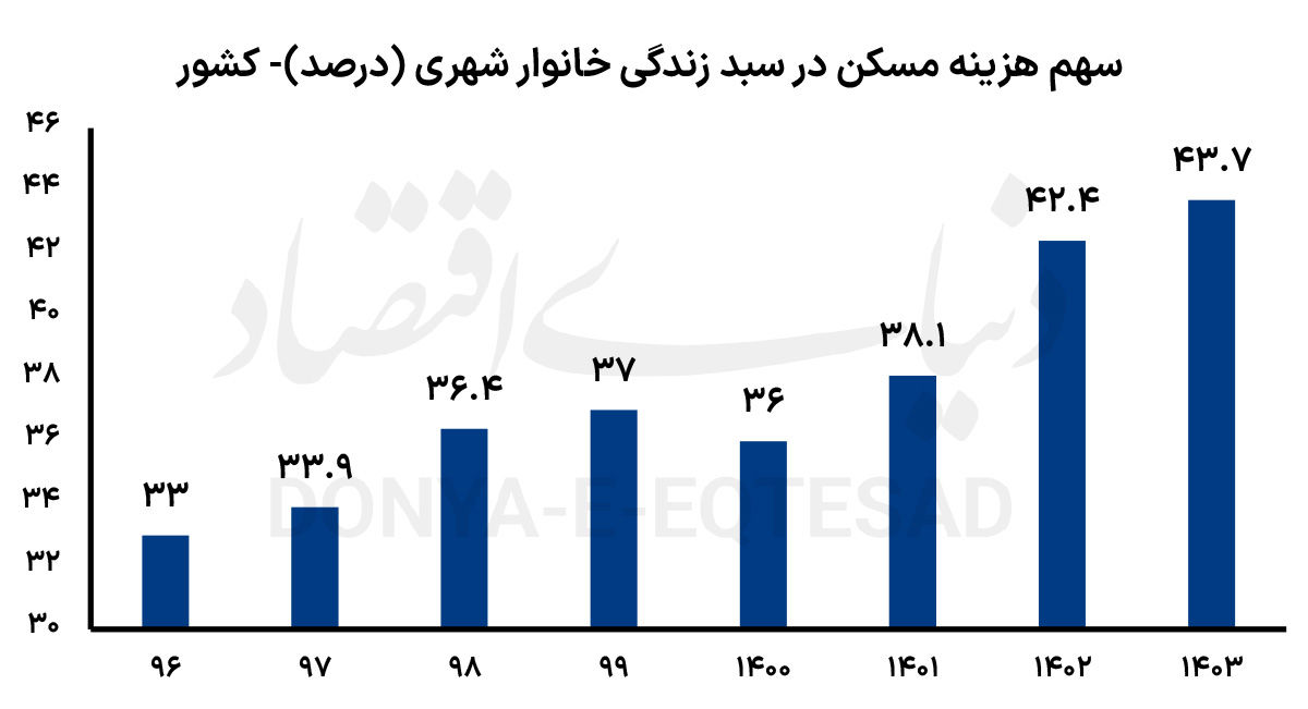 بررسی‌ها از روند سهم «مسکن» در سبد هزینه خانوارهای ایرانی حاکی است، این سهم طی ۸ سال گذشته با شیب معنادار و تند، از سطح «نسبتا قابل‌‌قبول» به سطح «کاملا غیر قابل‌قبول» جهش کرده است. سال ۹۶، زمانی که اقتصاد ایران و بازار مسکن و اجاره در وضعیت نرمال قرار داشت و بازارهای مختلف هنوز وارد عصر جهش قیمت‌ها نشده بود، «مسکن ۳۳ درصد سبد هزینه خانوارهای ایرانی» را مشغول کرده بود.