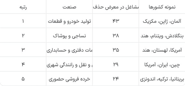 مطالعه مشترک سازمان همکاری و توسعه اقتصادی و سازمان بین‌المللی کار در سال ۲۰۲۵ صنعت را با بیشترین احتمال حذف مشاغل شناسایی کرده است: