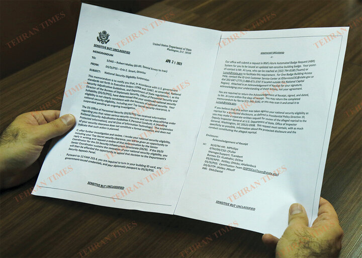 طبق این سندی که تهران تایمز منتشر کرده روز ۲۱ آوریل ۲۰۲۳ (اول اردیبهشت امسال)، «ارین اسمارت»، مدیر دفتر امنیت دیپلماتیک وزارت امور خارجه آمریکا این یادداشت را برای رابرت مالی ارسال میکند؛ یادداشتی که در آن دلایل لغو مجوز امنیتی رابرت مالی و برکناریاش به او اطلاع داده شده است.