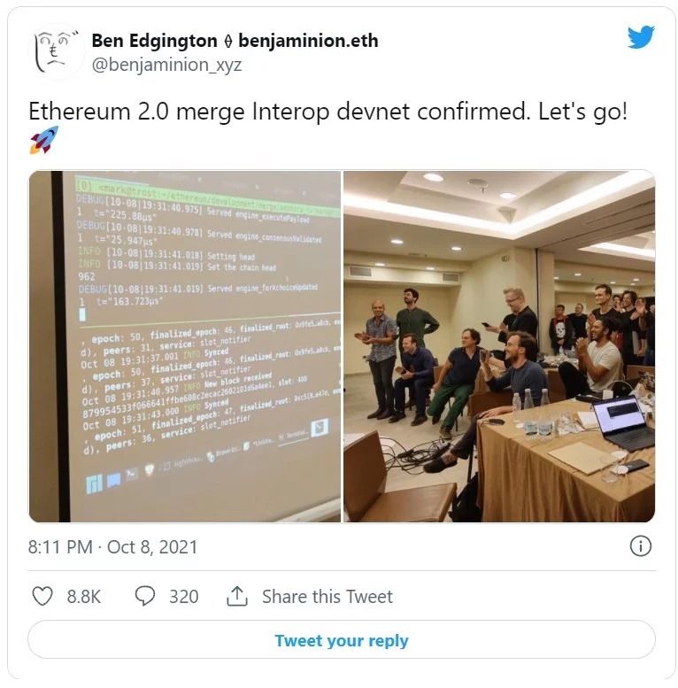 اجینگتون تصاویر لحظه ابتدایی یا همان Hello World شبکه توسعهدهندگان اتریوم ۲.۰ را به اشتراک گذاشته است. این تصاویر نشان میدهد توسعهدهندگان اتریوم نظیر ویتالیک بوترین در حال جشن گرفتن فعالسازی ادغام (Merge) هستند.