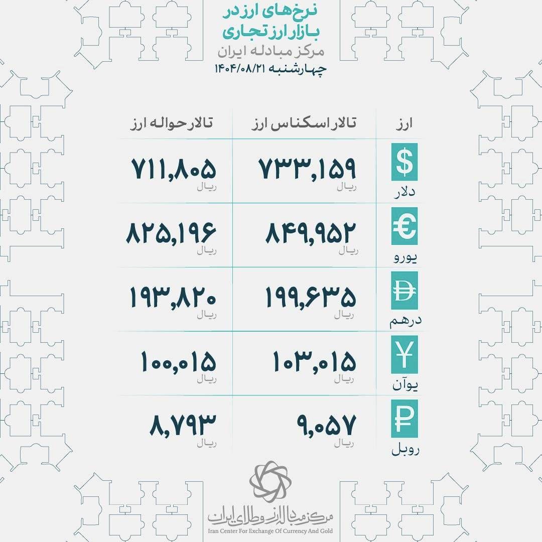 یورو نیز در بازار رسمی با افزایش ۸۴ هزار و ۹۹۵ تومان نرخ گذاری شد و حواله یورویی به ۸۲ هزار ۵۱۹ تومان رسید. درهم رسمی نیز ۱۹ هزار ۹۶۳ تومان و حواله آن ۱۹ هزار و ۳۸۲ قیمتگذاری شد.