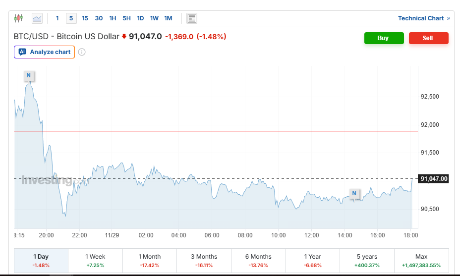 قیمت بیت کوین که در ابتدای روز در نرخ ۹۰ هزار و ۷۲۰ دلار قرار داشت؛ در ابتدا با افزایش تا نرخ ۹۱ هزار و ۵۰ دلار بالا رفت و با تغییر روند دوباره به کانال ۹۰ هزار دلار برگشت و در پایینترین نرخ روزانه ۹۰ هزار و ۵۰۰ دلار بود و در لحظه نگارش این گزارش دوباره با افزایش وارد کانال ۹۱ هزار دلار شده و در نرخ ۹۱ هزار و ۴۷ دلار قرار دارد.