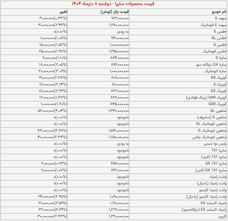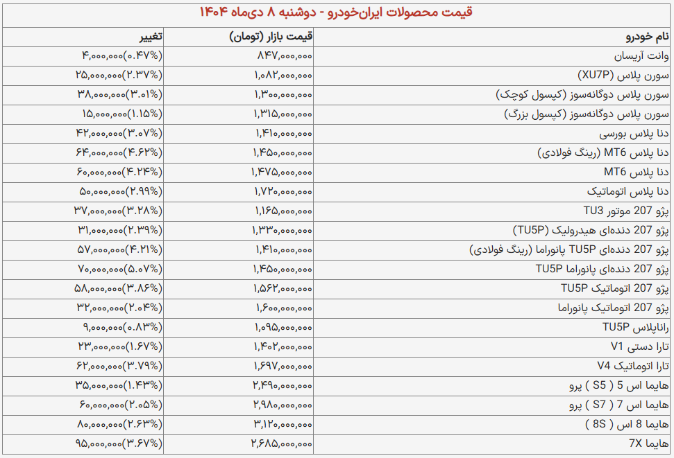 به گزارش خط بازار؛ بازار خودرو امروز دوشنبه ۸ دی ماه ۱۴۰۴ نیز شاهد افزایش بی سابقه قیمت ها بود و خودروهای پرفروش داخلی بار دیگر رکوردهای جدیدی ثبت کردند.