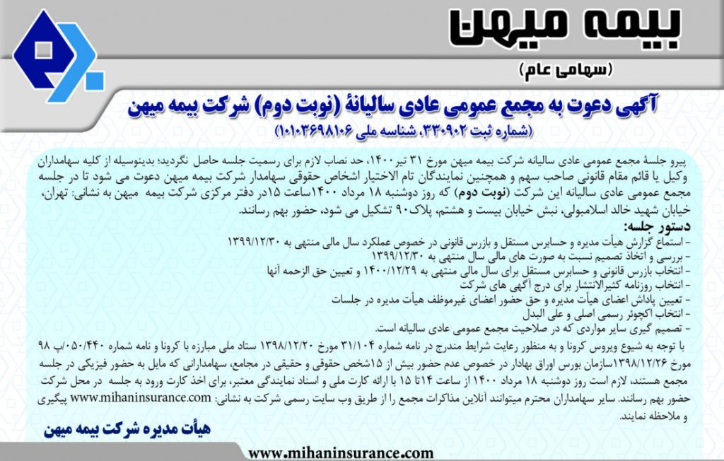 مجمع عمومی عادی سالیانه نوبت دوم بیمه میهن آنلاین برگزار میشود