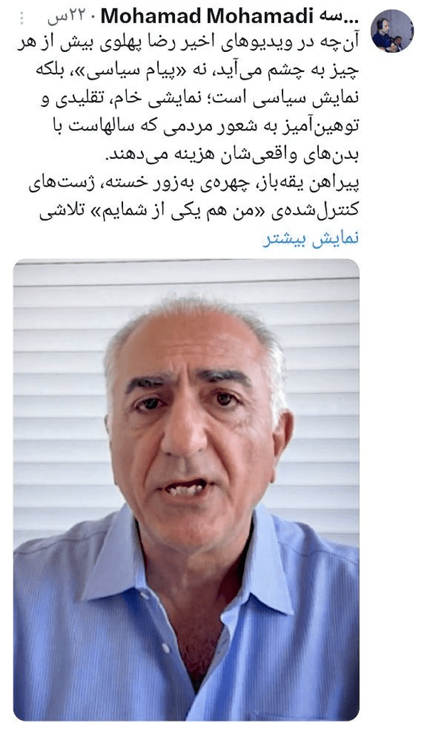 هرچند رضا پهلوی در پیام‌های دائم از «خیابان» سخن می‌گوید، اما کاربری در اکس، این‌گونه واکنش نشان داده است: «آن‌چه در ویدیوهای اخیر رضا پهلوی بیش از هر چیز به چشم می‌آید، نه «پیام سیاسی» بلکه نمایش سیاسی است؛ نمایشی خام، تقلیدی و توهین‌آمیز به شعور مردم… پیراهن یقه‌باز، چهره‌ی به‌زور خسته، ژست‌های کنترل‌شده‌ی «من هم یکی از شمایم» تلاشی است ناشیانه برای مصادره‌ی خیابان؛ خیابانی که او هیچ نسبتی با آن ندارد».