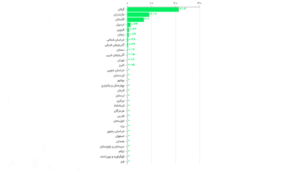 پس از آن، استان مازندران با ۹.۱۹ میلیمتر و گلستان با ۶.۹ میلیمتر در رتبههای بعدی قرار گرفتند که این موضوع بار دیگر نقش اقلیم مرطوب و پربارش سواحل دریای خزر را برجسته میکند.در میان سایر استانها، اردبیل با ۱.۳۴ میلیمتر، قزوین با ۰.۷۲ میلیمتر و زنجان با ۰.۶۳ میلیمتر بارش داشتند.