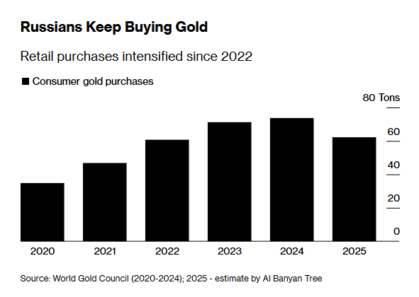 به گزارش بلومبرگ، طبق یک مطالعهی جدید، مصرفکنندگان روسی در سال جاری به اندازه ذخایر طلای کشورهای اسپانیا یا اتریش، طلا در اختیار خواهند داشت؛ روندی که نشان میدهد این فلز گرانبها طی چهار سال گذشته به یکی از محبوبترین گزینههای پسانداز در روسیه تبدیل شده است.