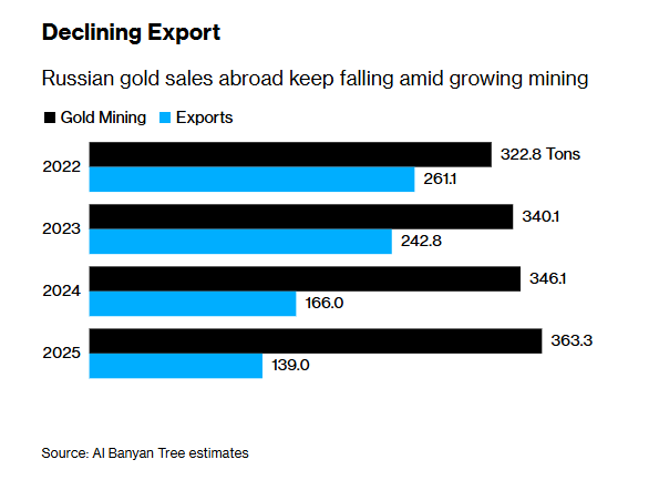 گزارش Al Banyan Tree نشان میدهد که فروش داخلی طلا همچنین توسط خریدهای بانکهای روسی پشتیبانی میشود؛ بهطوریکه در ماه اوت ۲۰۲۵ حدود ۵۷.۶ تن طلا در اختیار این مؤسسات بوده است.