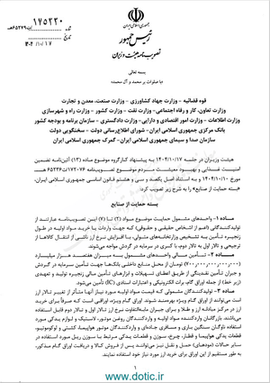 بر اساس ماده (۴) این مصوب، حمایتهای موضوع ماده ۲ در قالب دستورالعمل ابلاغی وزارت صنعت، معدن و تجارت، وزارت جهادکشاورزی و وزارت امور اقتصادی و دارایی تدوین و اجرا میشود.