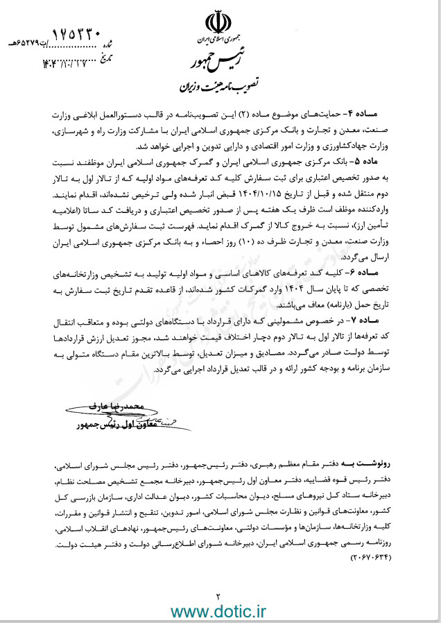 ماده (۵) این تصویبنامه بیان می کند که بانک مرکزی و گمرک موظفند نسبت به صدور تخصیص اعتباری برای ثبت سفارش همه کد تعرفههای مواد اولیه که از تالار اول به دوم منتقل شده و پیش از تاریخ ۱۵ دیماه سال ۱۴۰۴ قبض انبار شده و ترخیص نشدهاند، اقدام کند.