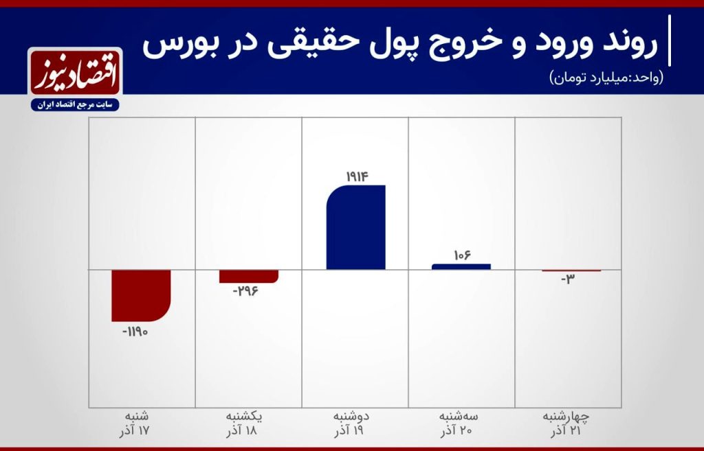 روز سهشنبه ۱۰۶ میلیارد تومان سرمایه حقیقی وارد شد و رشد شاخص نیز تداوم داشت. روز چهارشنبه نیز پول حقیقی خارج شد و ارزش تغییر مالکیت حقوقی به حقیقی بازار ۳ میلیارد تومان بود. شاخص کل در آخرین روز معاملاتی هفته بیش از ۲۴ هزار واحد رشد کرد و به رقم ۲ میلیون و ۵۴۳ هزار واحد رسید.