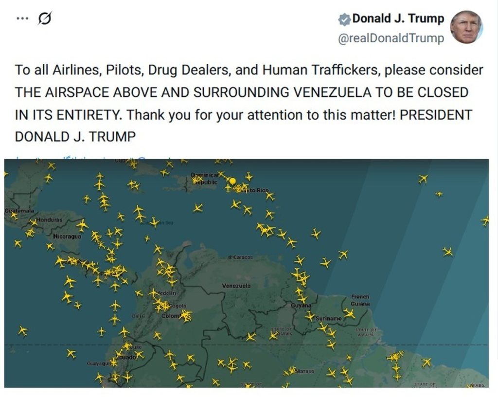او نوشت: “به همه خطوط هوایی، خلبانان، فروشندگان مواد مخدر و قاچاقچیان انسان، لطفاً حریم هوایی بالا و اطراف ونزوئلا را به طور کامل بسته در نظر بگیرید. از توجه شما به این موضوع متشکرم! رئیس جمهور دونالد جی. ترامپ”