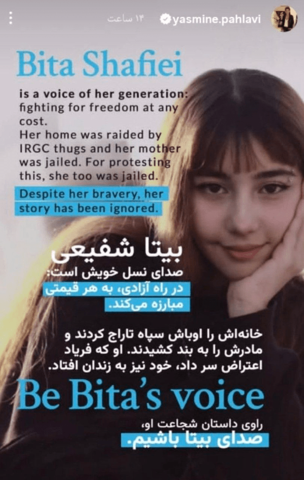 در فاصلهای کوتاه پس از بازداشت او، لشکر رسانهای منتسب به پهلویها با محوریت یاسمین پهلوی و همراهی چهرههایی چون حمید فرخنژاد و مهدی نصیری، کمپینی برای «نجات بیتا شفیعی» به راه انداخت. شدت و هماهنگی این موج رسانهای، شباهت انکارناپذیری به پروژههای قبلی معاندان «از جمله مدلسازی ماجراهایی چون مهسا امینی و نیکا شاکرمی» داشت.