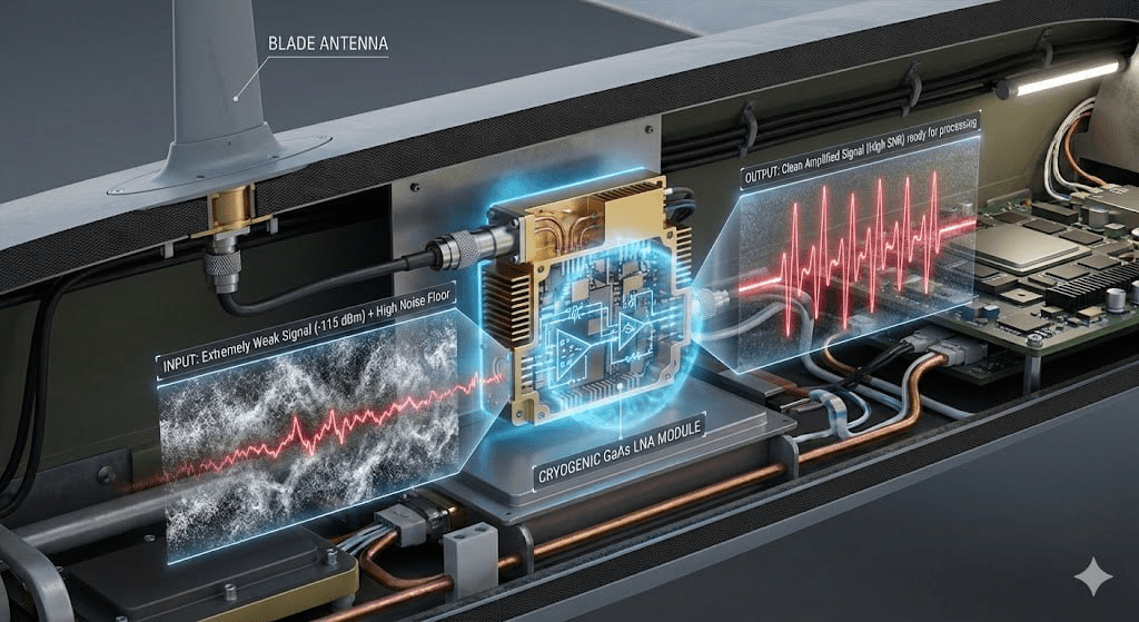 راهکار: LNAهای ساخته شده از مواد نیمه‌هادی پیشرفته (مانند گالیم آرسنید)، سیگنال ورودی را بدون افزودن نویز حرارتی قابل توجه، تقویت می‌کنند. حساسیت این گیرنده‌ها به قدری بالاست که می‌توانند سیگنال‌هایی با توان کمتر از dBm 110- را آشکارسازی کنند. این یعنی شکار سیگنال‌های LPI (احتمال رهگیری پایین) که دشمن عمداً ضعیف ارسال می‌کند تا شنود نشوند.